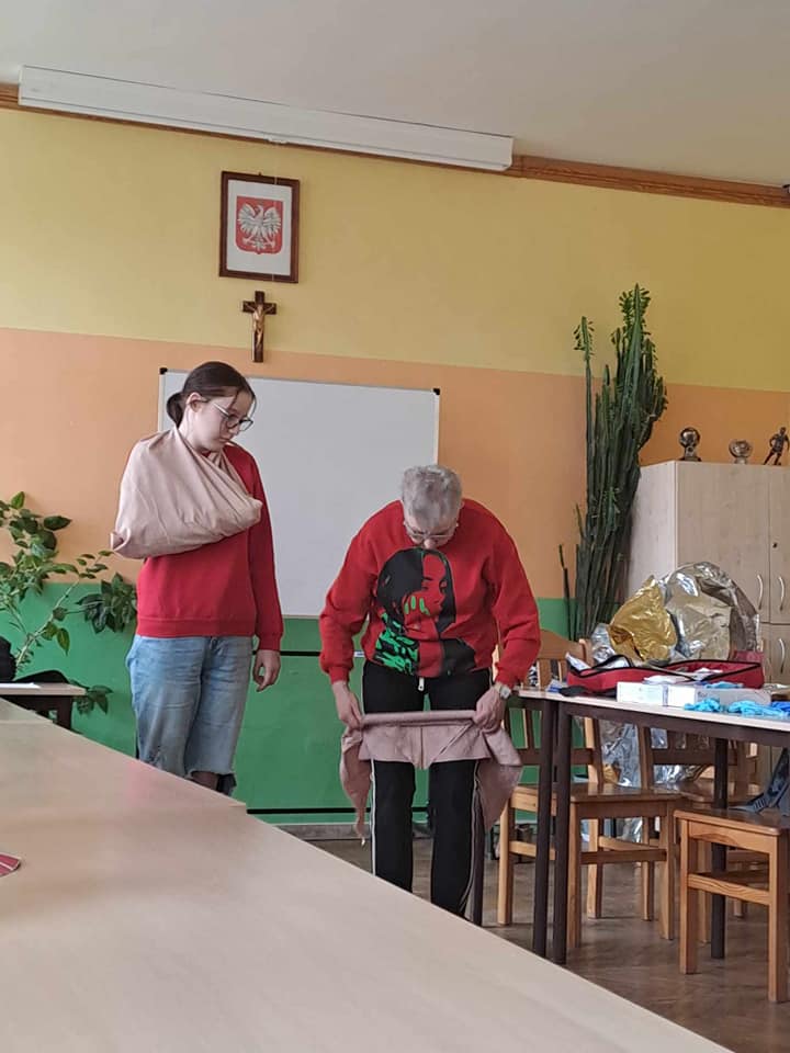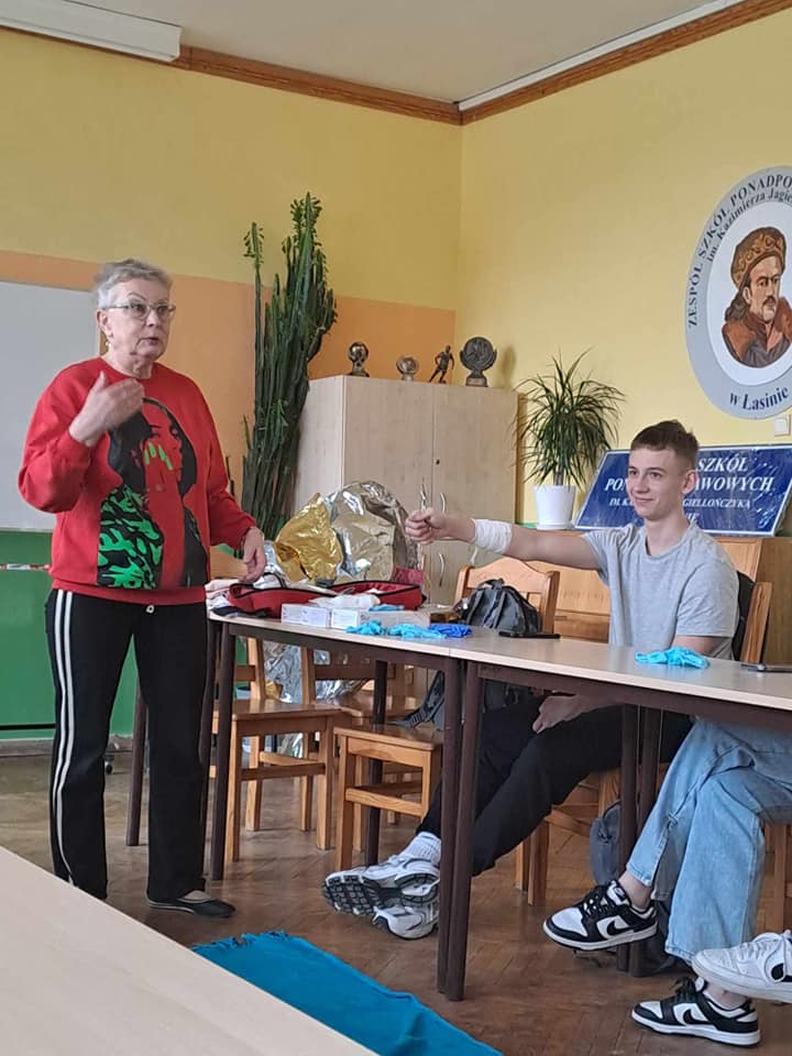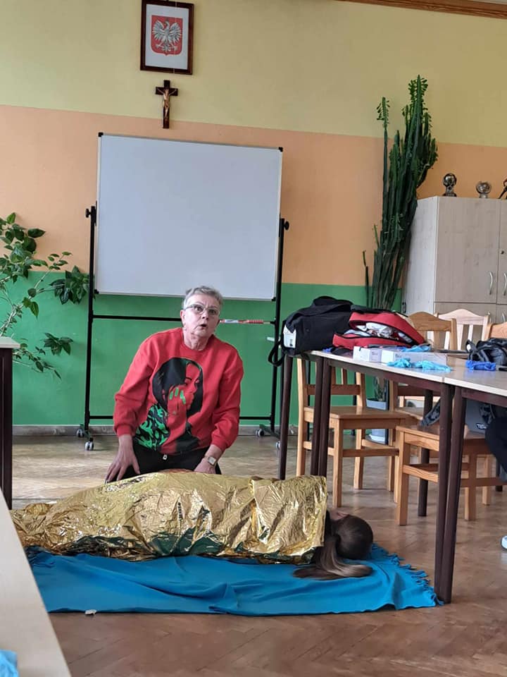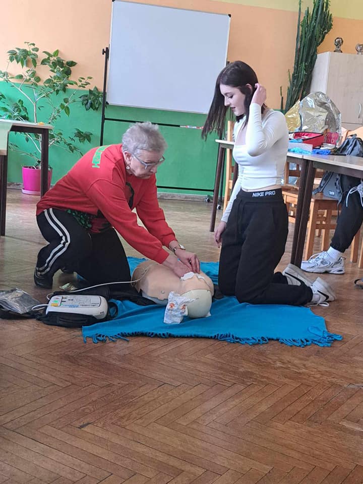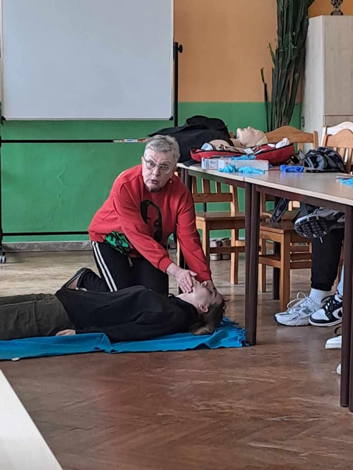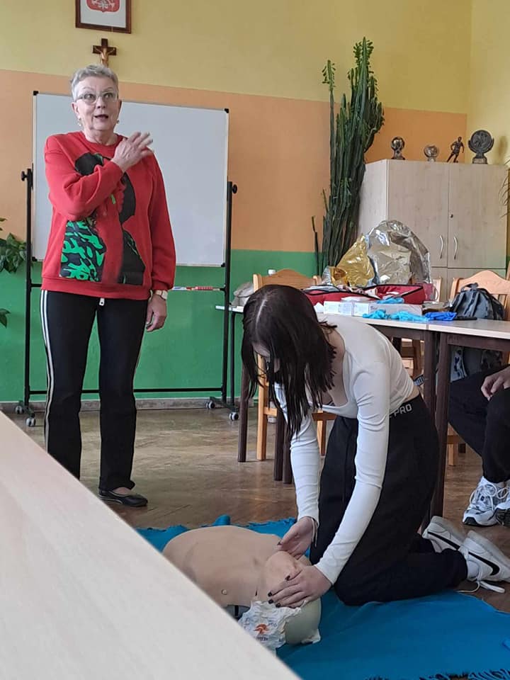 W ubiegłym tygodniu odbyło się szkolenie z pierwszej pomocy przedmedycznej dla uczniów naszej szkoły, które przeprowadziła pani Ewa Szymańska z ZR PCK w Grudziądzu. Podczas spotkania zostały przypomniane zasady udzielania pierwszej pomocy osobom, które np. straciły przytomność, poparzyły się, zakrztusiły się lub uległy innym wypadkom. Uczestnicy mogli przećwiczyć m.in. resuscytację krążeniowo- oddechową czy opatrywanie ran i krwotoków. W szkoleniu uczestniczyło 23 uczniów.