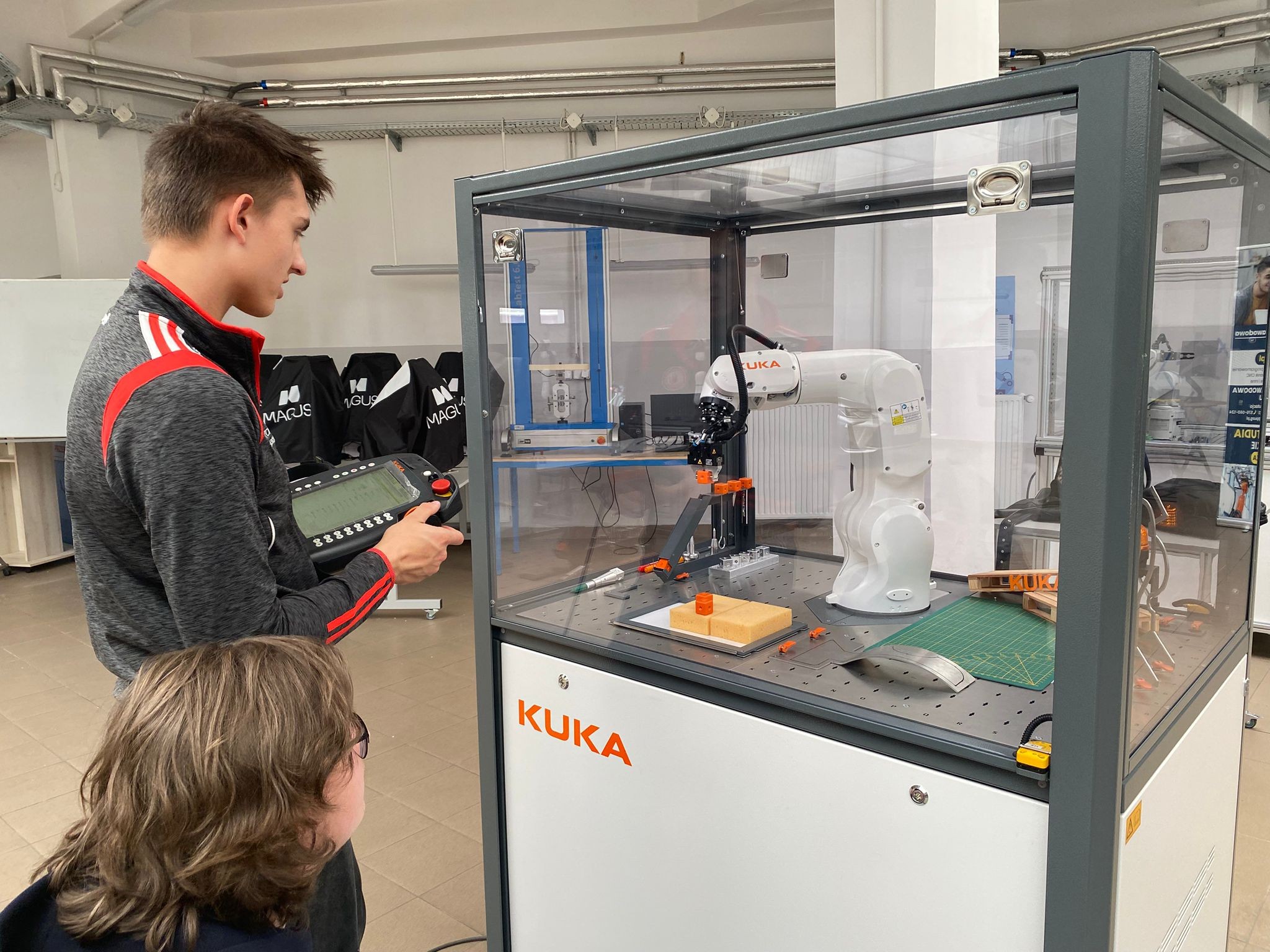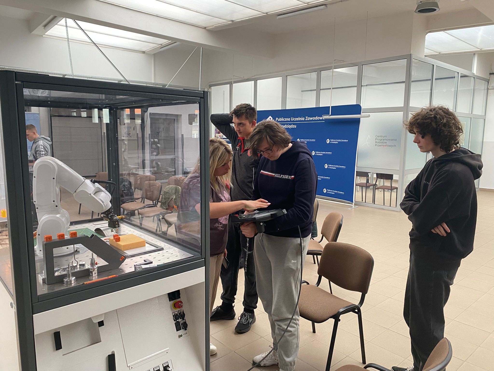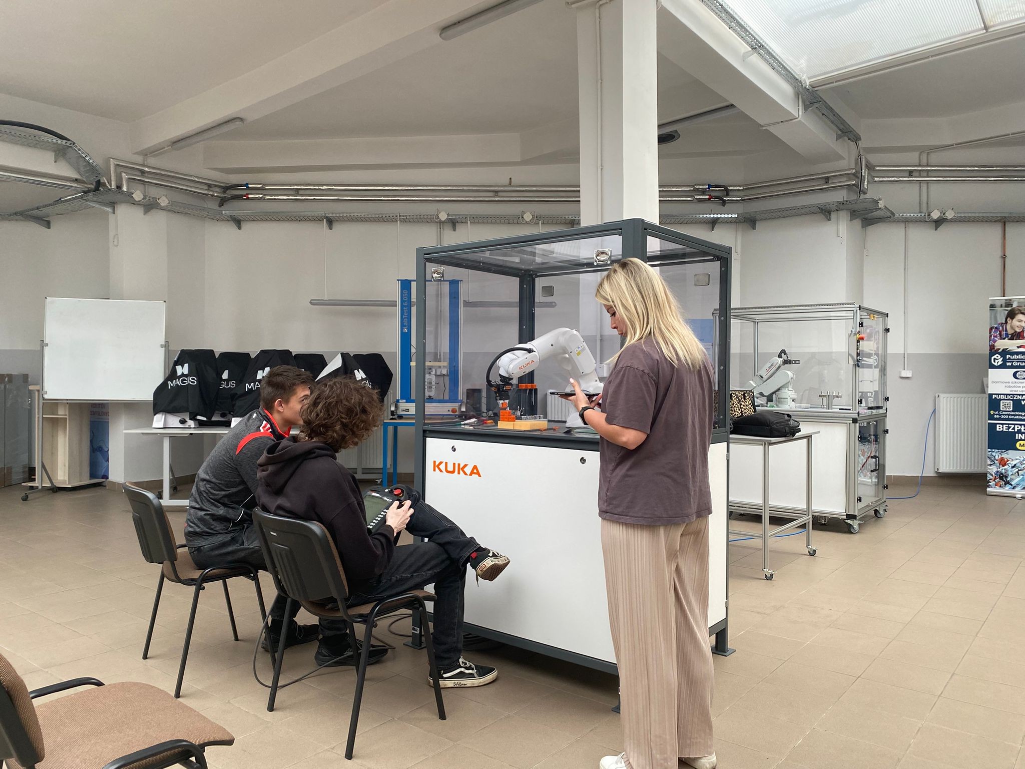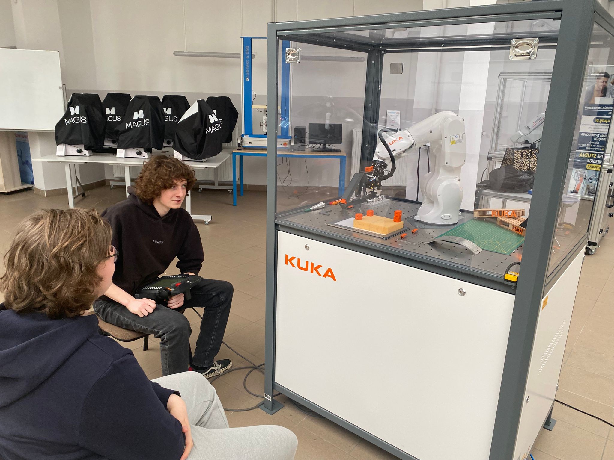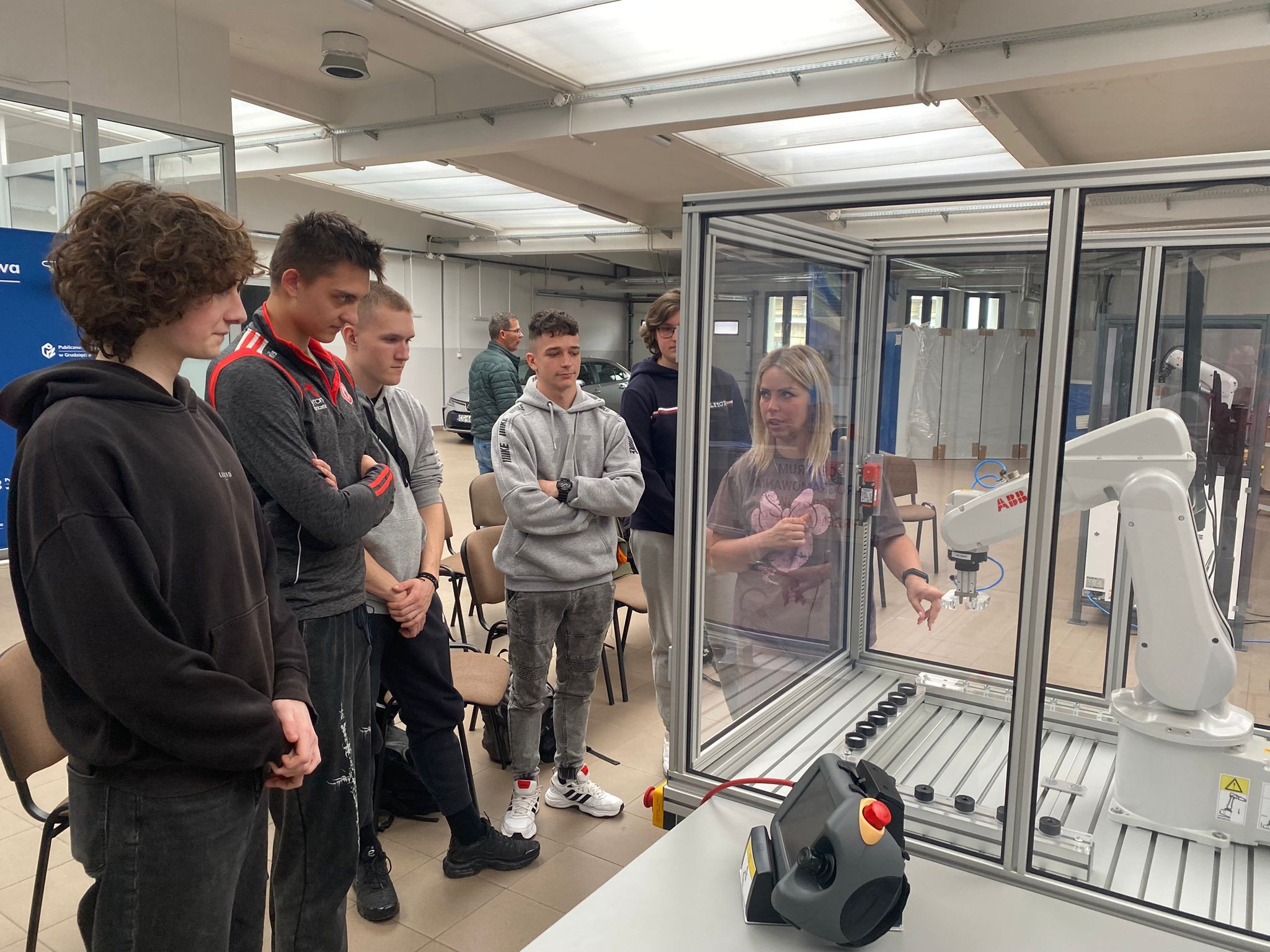 Po wprowadzeniu teoretycznym uczniowie mieli okazję samodzielnie pracować z robotami KUKA i ABB, ucząc się ich obsługi oraz podstaw programowania. Dzięki temu mogli zobaczyć, jak teoria przekłada się na praktykę i jak działają nowoczesne systemy automatyki.