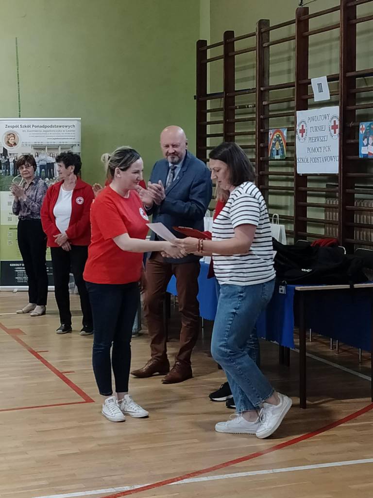Wczoraj w naszej szkole został przeprowadzony III Powiatowy Turniej Pierwszej Pomocy PCK Szkół Podstawowych. Był to jednocześnie X jubileuszowy konkurs, gdyż wcześniej 7 razy organizowany był taki sam dla szkół gimnazjalnych. W turnieju startowało 9 drużyn z 7 szkół. Młodzi ratownicy musieli wykazać się wiedzą i umiejętnościami z zakresu udzielania pierwszej pomocy przedmedycznej. Po wykonaniu wszystkich zadań na stacjach wypadkowych oraz rozwiązaniu testu wiedzy, podium zdobyli: